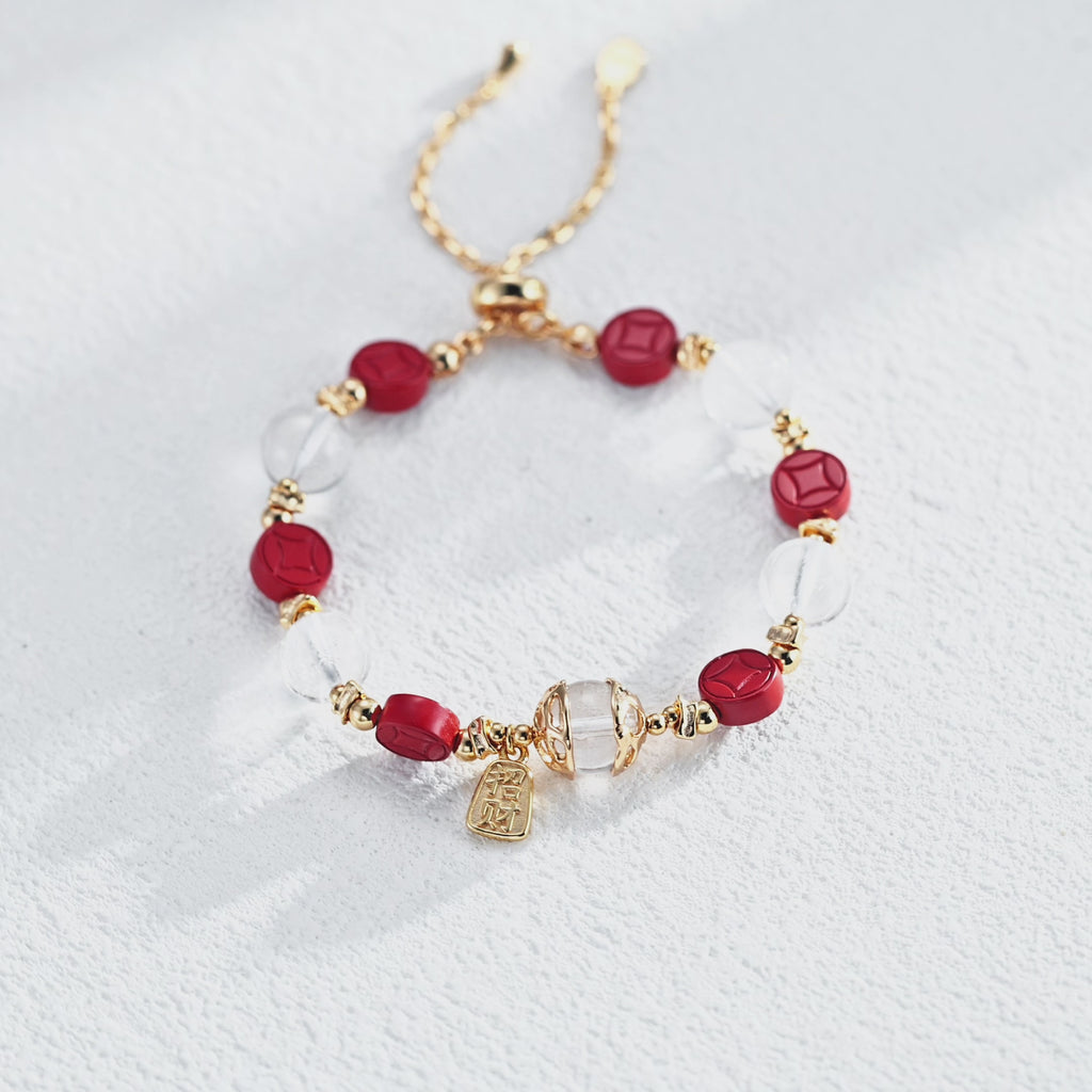 Fortune & Prosperity Bracelet: Cinnabar Coin with White Crystal